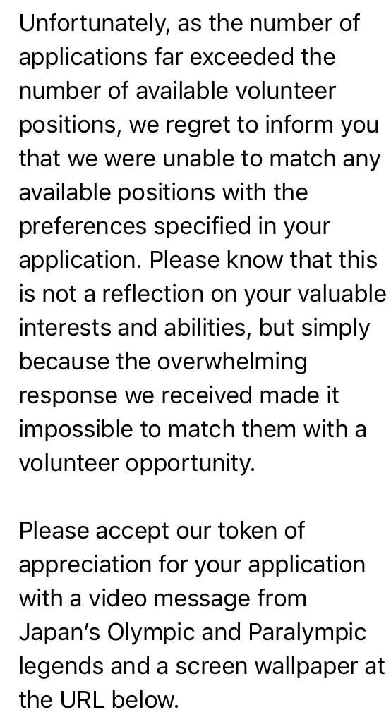 On receiving a nice email after (unsuccessfully) applying to be a volunteer at the Tokyo 2020 Paralympics