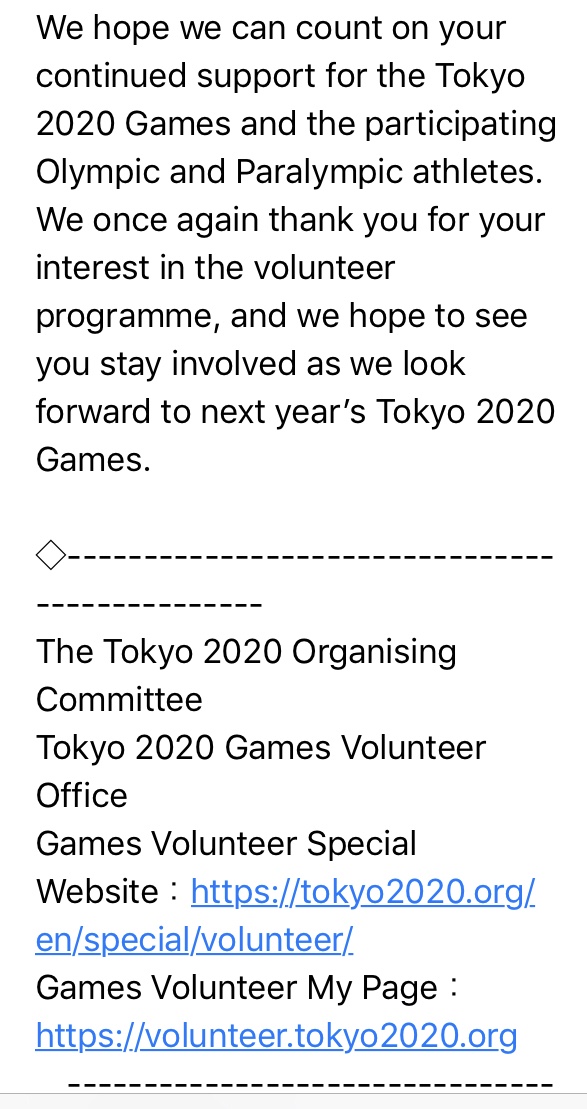 As described here, Barrier Free Japan applied to be a volunteer at the Tokyo 2020 Games. On September 13th, Barrier Free Japan received an email saying the application was unsuccessful. However, the received response, albeit an automated one, was kind of nice: