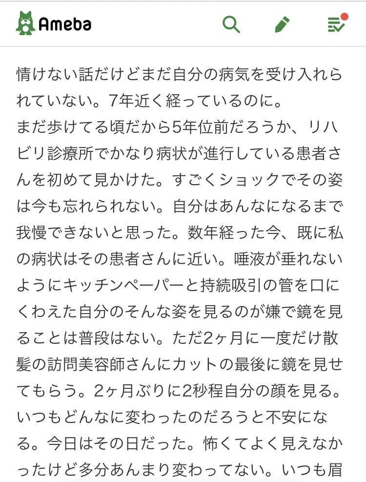 It was I was still walking, it was probably about five years ago. I first saw a patient in a rehabilitation clinic who had a fairly advanced medical condition. It’s so shocking that I can’t forget their appearance. I thought I couldn’t stand until that much. A few years later, my condition is already close to that patient. I hate to see such a figure with a kitchen paper and a tube of continuous suction in my mouth so that saliva won’t drip, so I don’t usually look in a mirror. Only once every two months, a visiting hairdresser who gives me a haircut shows me the mirror at the end of the cut. Looked at my face for 2 seconds after 2 months. I’m always worried about how different things have changed. Today was that day. I was scared and didn’t look good, but maybe it hasn’t changed much. I always have wrinkles between my eyebrows, a grumpy face, and even if I try to laugh, my muscles are tight and I don’t smile.“