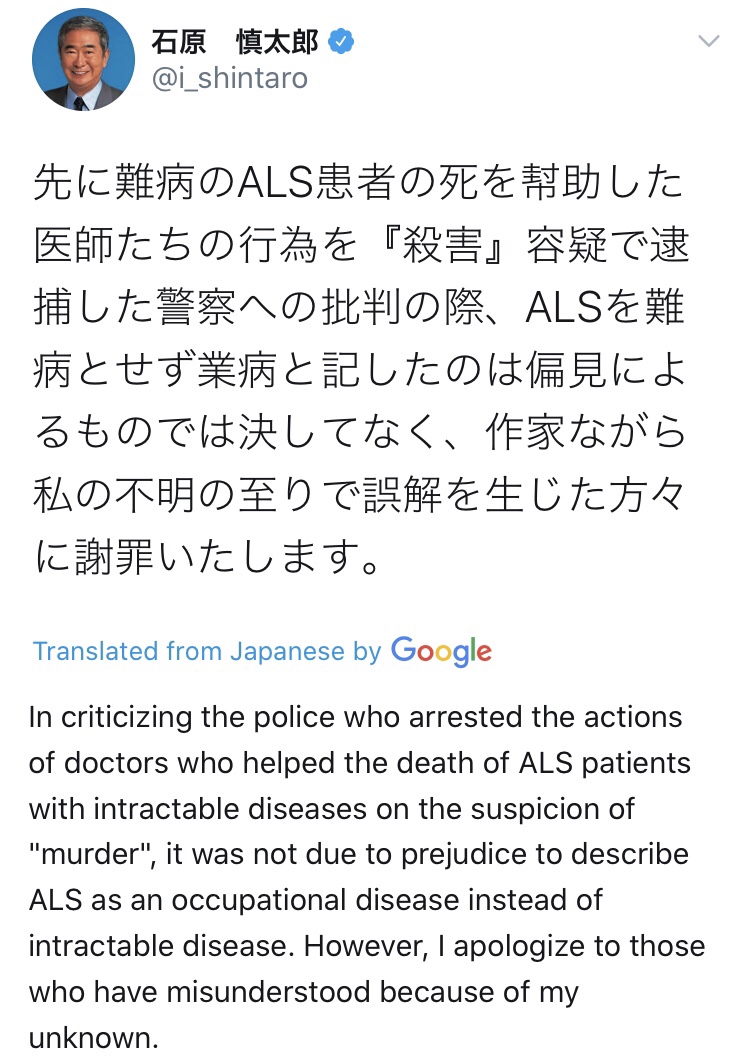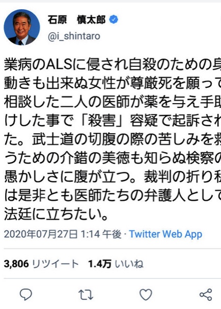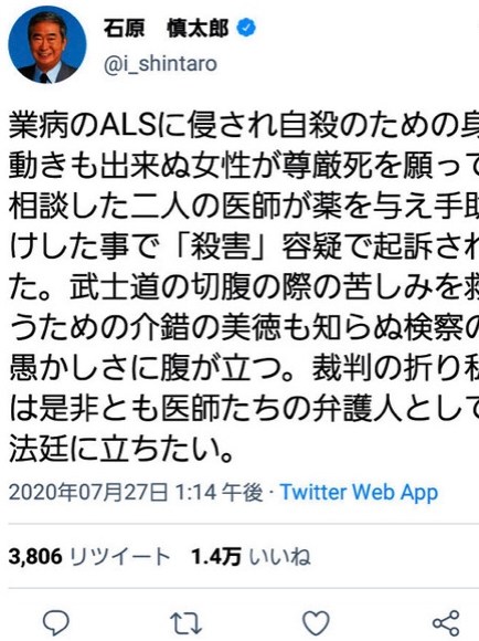 Following the arrest of two doctors alleged to have assisted the suicide of a woman named Yuri Hayashi who had ALS; the former Governor of Tokyo, Shintaro Ishihara, made a comment on Twitter that many regarded as controversial.