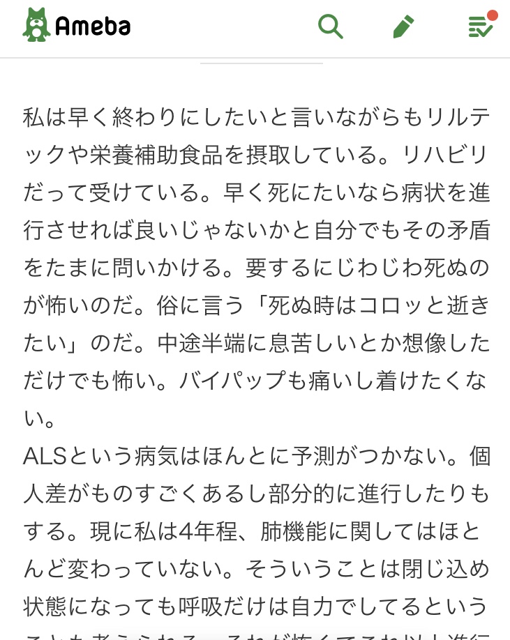 In a blog post entitled ‘Dying with ALS and a conflict of mind‘, posted on June 13 2018, Hayashi wrote about how her lung function was decreasing, but that she cannot die until her lung function fails completely, and remarked on the “contradictory” nature of her ALS: