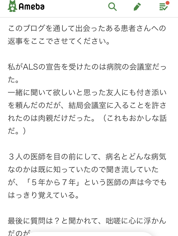 “It was in the hospital meeting room that I was sentenced to ALS. I asked a friend who I wanted to listen to with me, but only my relative was allowed to enter the meeting room. (This is also a strange story.)