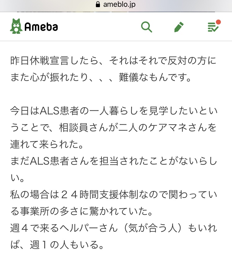 On August 28 2018 in blog post entitled. ‘ALS patients living alone-visit’, Hayashi talks about the difficulties organizing care and finding an apartment that the owner will rent to her ”