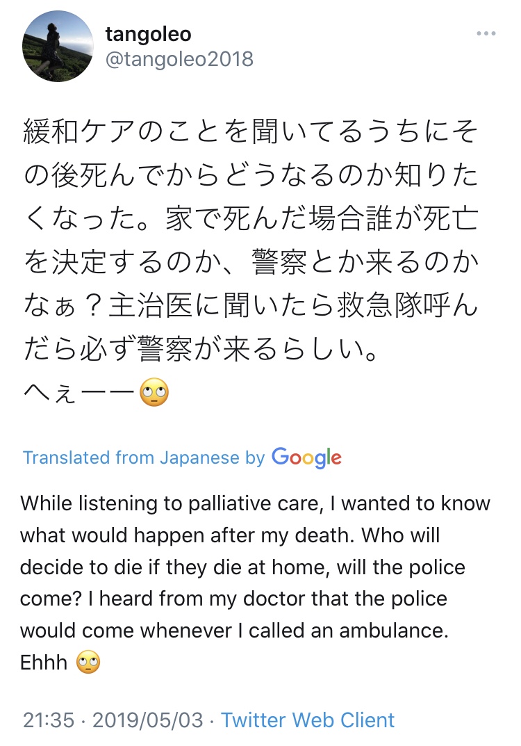 In the meantime Hayashi did post on Twitter. On May 3 2019, she posts on Twitter about what might happen whilst undergoing palliative care, or after her death, wondering “will the police come?”