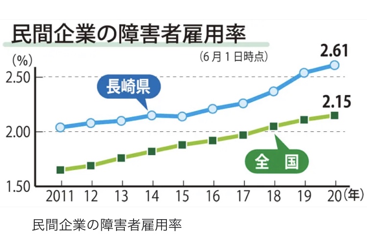 NAGASAKI – The Nagasaki Labor Bureau has summarized the employment situation of persons with disabilities in the prefecture (as of June 1, last year). In private companies, the actual employment rate, which indicates the ratio of persons with disabilities to employees, increased by 0.07 points from the previous year to 2.61%, the highest ever since the start of aggregation in 1977. The national ranking was 4th, up two places from the previous survey. On the other hand, public institutions fell below the statutory employment rate in prefectural boards of education and Sasebo City.