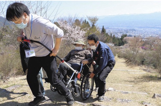 NAGANO – The voluntary organization “Minami Shinshu Outing Team” created by the Achi Hirugami Tourist Bureau in Chisato Achi Village and “Kafune Nursing” in the north of Iida City rents and assists wheelchairs equipped with the towing assistance device “JINRIKI”. The service includes the dispatch of people. The group was established in March and aims to promote universal tourism so that wheelchair users such as the elderly and people with disabilities can enjoy sightseeing with peace of mind.