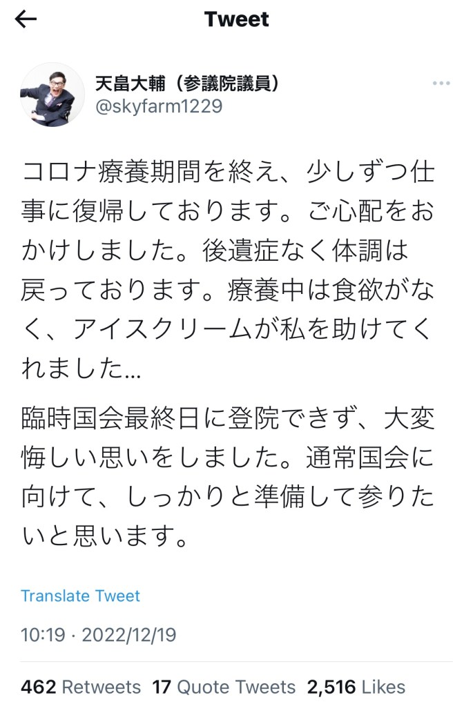 JAPAN – Daisuke Tenbata, who has been a member of the House of Councillors and a member of the Reiwa Shinsengumi party since being elected in July 2022, tweeted on December 19th that he has recovered from COVID after his staff tweeted that he had been infected on December 10th.