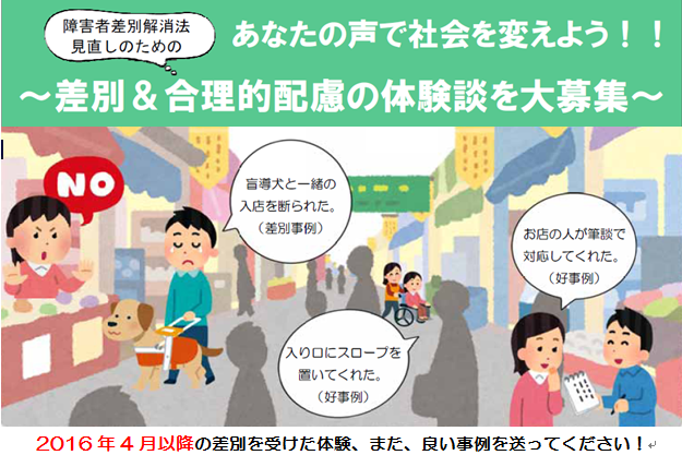 0 comments on “【障害者差別事例、好事例大募集!】障害者差別解消法中央省庁の対応指針改定へ働きかけます(受付締切:2月28日)”