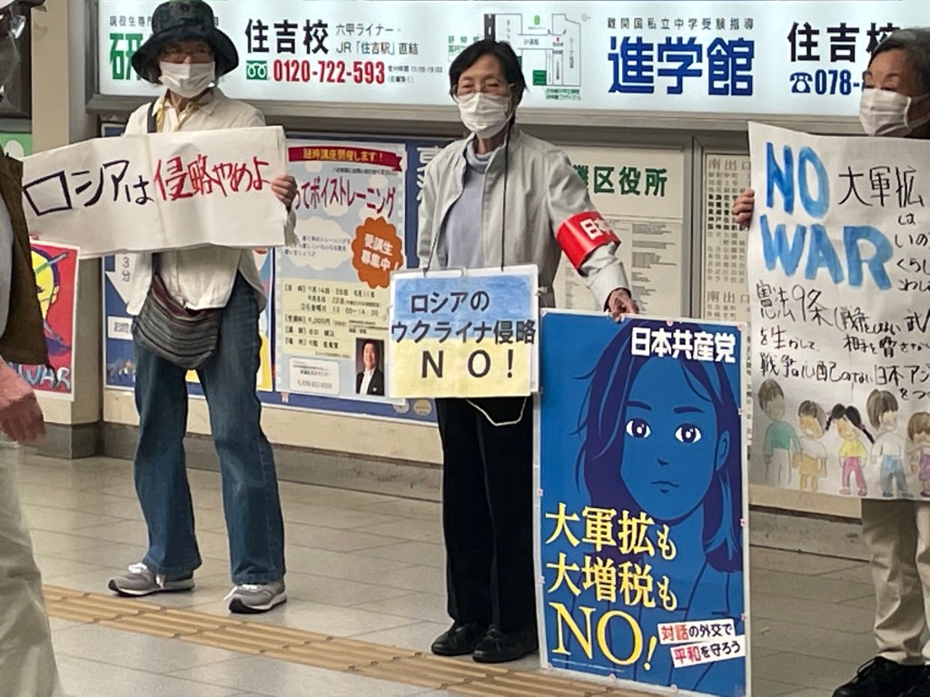 KOBE, Higashinada Ward– An anti-war group in Kobe, Japan, stand outside JR Sumiyoshi Station; with signs highlighting the war in Ukraine as the G-7 Summit takes place in Hiroshima.