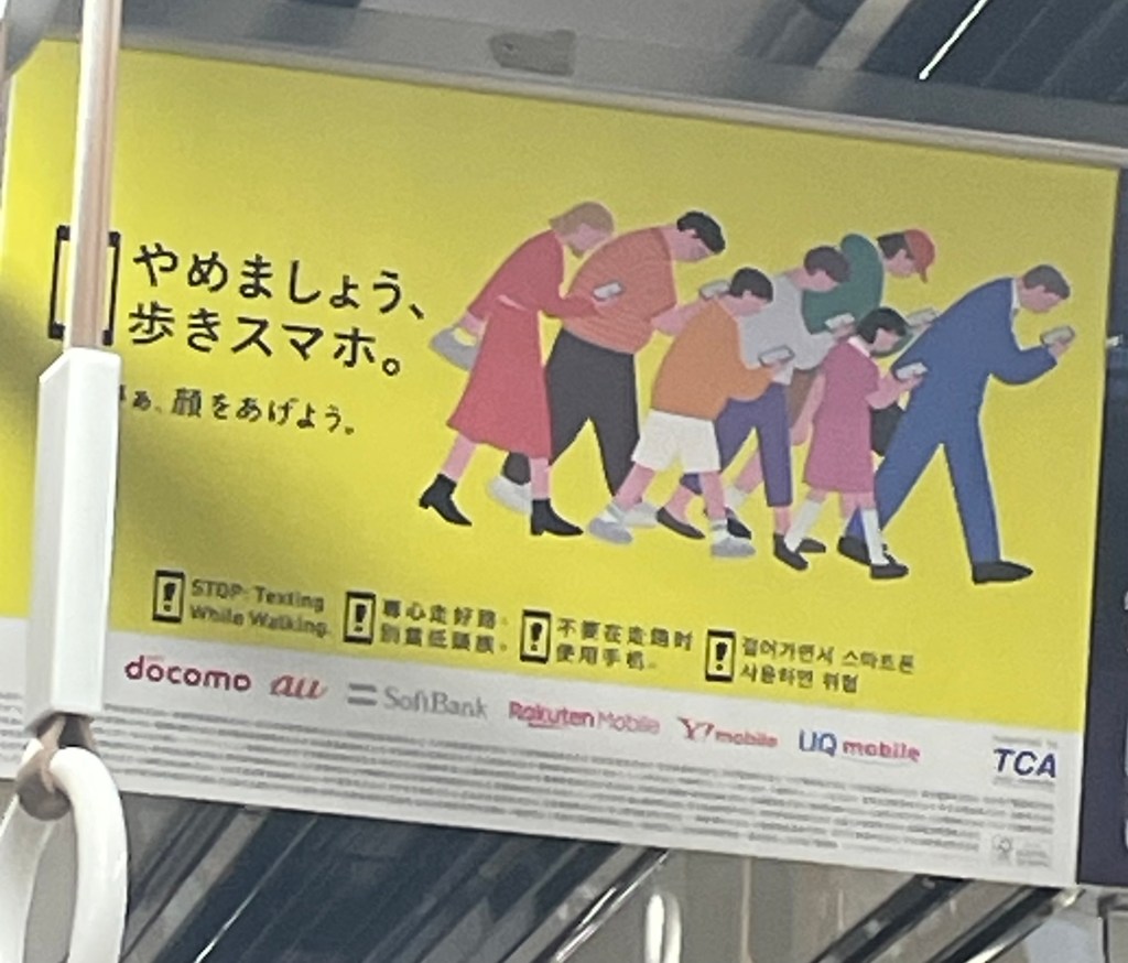 JAPAN – Barrier Free Japan has noticed a number of adverts and leaflets at train stations of late. Specifically they are aimed at discouraging people from walking on escalators or walking whilst looking at their smartphones.