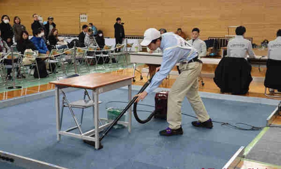 In the building cleaning competition, 13 participants demonstrated their cleaning skills, showcasing precision and professionalism. During the vacuuming task, contestants carefully cleaned a mock office space of 16 square meters, maneuvering around desks and chairs with great attention to detail.