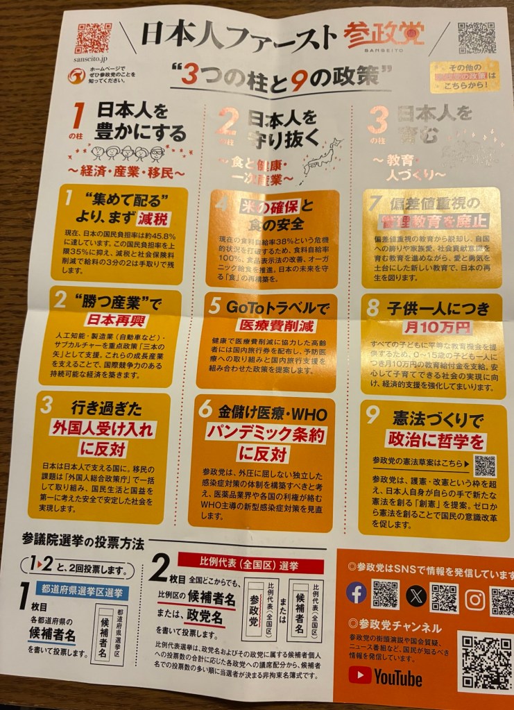 Still, it was somewhat unexpected when Barrier Free Japan, a foreign resident in Kobe was handed a leaflet by one of Japan’s more recently established and increasingly vocal political parties: Sanseito (参政党). Bright orange and emblazoned with the slogan “Don’t destroy Japan any further” (これ以上、日本を壊すな), the leaflet’s assertive tone immediately stood out. It promotes a platform built around the phrase “Japanese People First” (日本人ファースト), and outlines what the party calls its “three pillars” and “nine policies.”