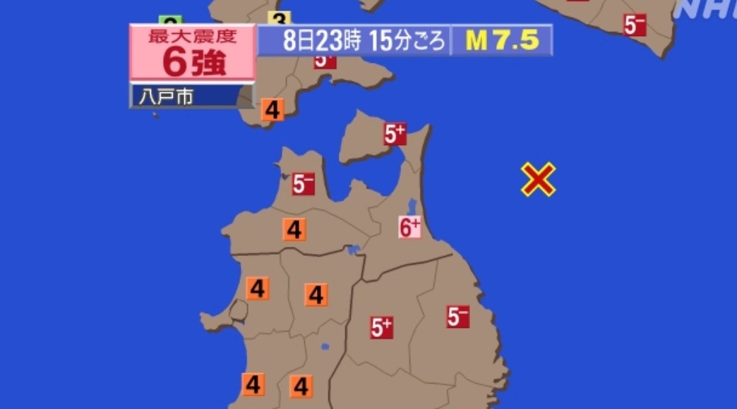 The temblor, with an estimated magnitude of 7.6, occurred at a depth of about 50 kilometers off the east coast of Aomori around 11:15 p.m., with upper 6 registered in the city of Hachinohe in the prefecture and lower 6, the third-highest level, in the Aomori towns of Oirase and Hashikami.
