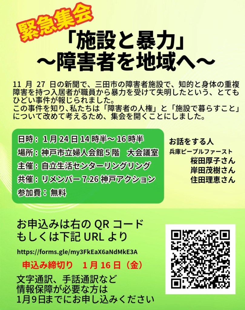Hyogo – People with disabilities in Hyogo Prefecture will hold an emergency rally in Kobe on January 24th to protest violence at residential care facilities and to call for the early realization of deinstitutionalization. The gathering was prompted by reports that a resident with intellectual and physical disabilities died after being assaulted by staff at a facility in Sanda City. Organized by the Independent Living Center ‘Ring Ring’ and co-hosted by ‘Remember 7.26 Kobe Action’, the event will feature speakers from ‘Hyogo People First’ and will focus on disability rights and the need for community-based living.