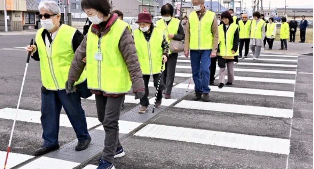 Visually impaired individuals and others crossing a crosswalk with widened intervals between the white lines (in Mitoyo City, Photo by The Yomiuri Shimbun)