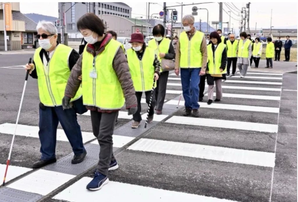 About 45 people, including members of the visually impaired group “Mitoyo Visual Impairment Support Center Hikari,” took part in the trial event. The group’s chairman, Takaaki Uemura, praised the crossing, saying, “Because of the escort zone, I was able to walk straight within the crosswalk and felt reassured.” Akihiro Manabe, assistant head of the division, said, “We hope the new-standard crosswalk will contribute to creating a barrier-free environment.”