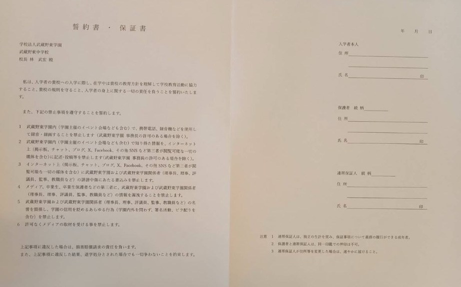 Musashino Higashi Gakuen, chaired by businessman Kenzo Matsumura, operates an elementary school, junior high school and vocational high school in the city of Musashino. The pledge included a clause stating parents would be subject to claims for damages if they violated its terms, prompting some to voice strong concerns, describing the measure as “suppression of free speech.”