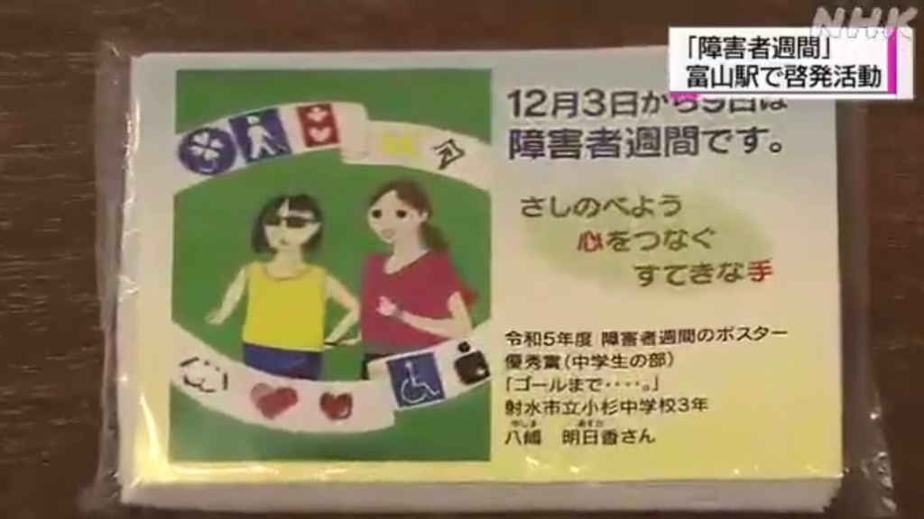 At Toyama Station on the morning of December 4th, members of prefectural organizations for people with disabilities and prefectural employees handed out pocket tissues for awareness and called for understanding among station users.