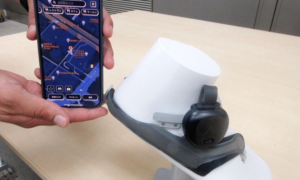 Paired with a smartphone app, the device developed by Ashirase wraps around the foot and sends prompts by vibration. It contains a motion sensor to detect the user’s position and signal a turn at the appropriate time.