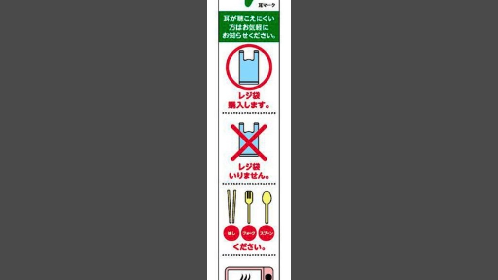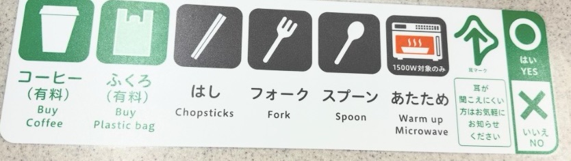At some branches of 7-11, as you walk up to pay, you might see this mat, stuck to the counter. The mat has images with writing underneath, the writing is in Japanese & English and below the images it reads: ‘Buy Coffee’, ‘Buy Plastic Bag’, ‘Chopsticks’, ‘Fork’, ‘Spoon’, ‘Warm Up Microwave’, ‘Yes’ & ‘No’.
